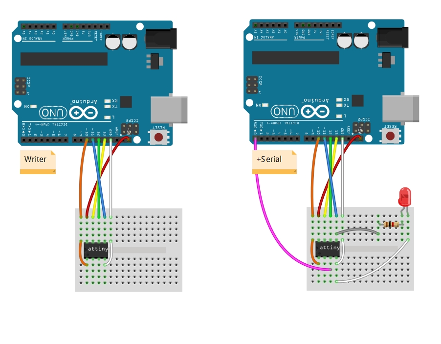 Program UART on ATtiny13. I showed an example of software UART for ATtiny13 and thus used the Arduino IDE as a development environment. ATtiny13 is clocked from the internal RC circuit.